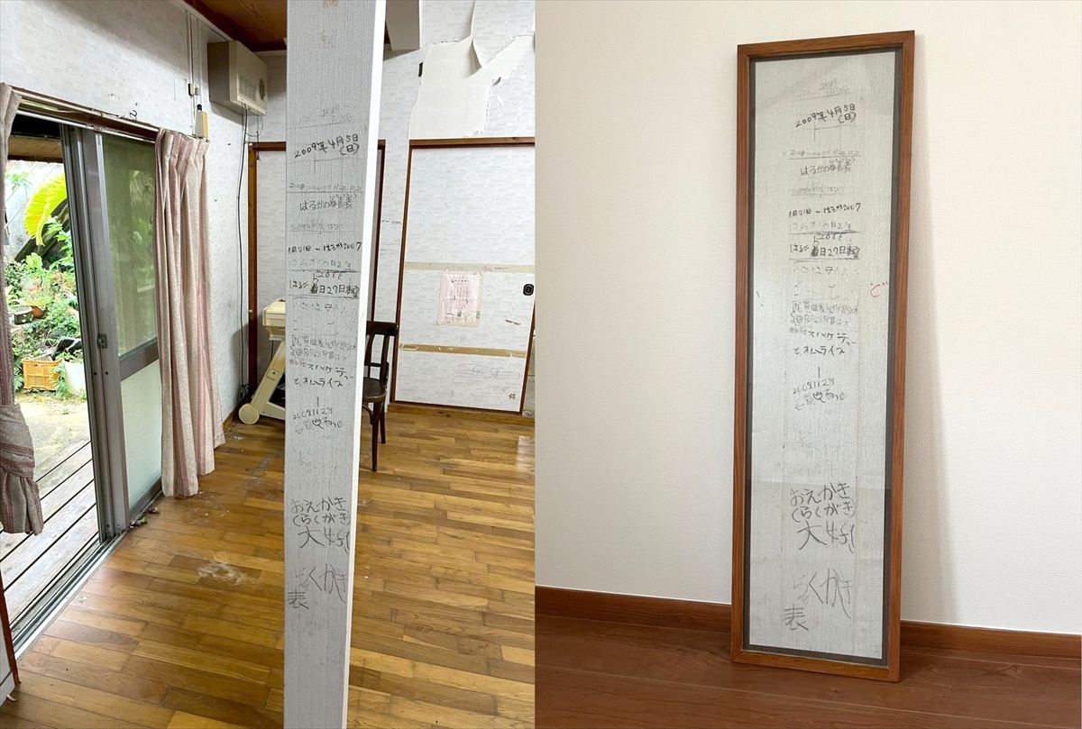 そして今回、施主様への提案として、壁に残っていたお子様の落書きや成長の記録を額縁へ入れてお渡ししました