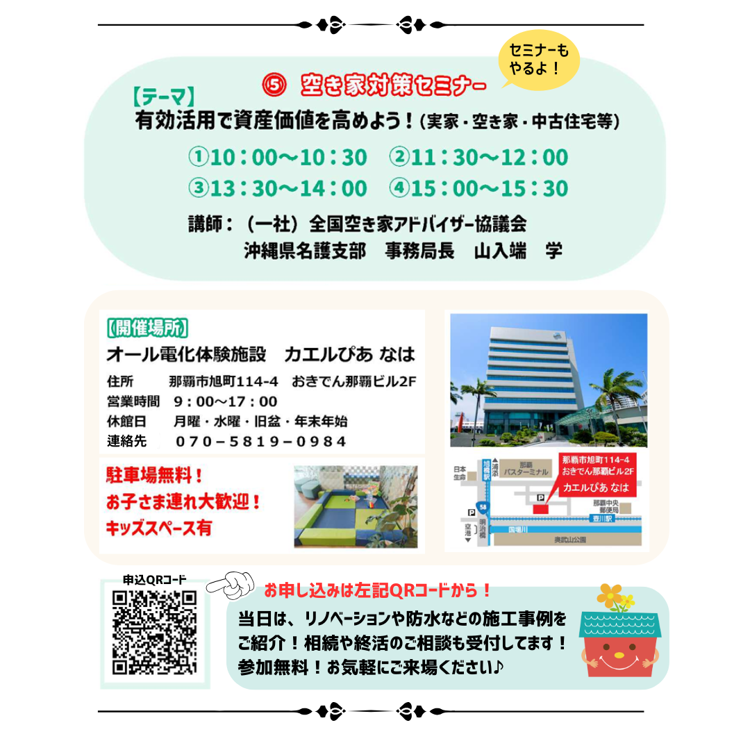 【開催場所】オール電化体験施設 カエルぴあなは 那覇市旭町114-4 おきでん那覇ビル2F