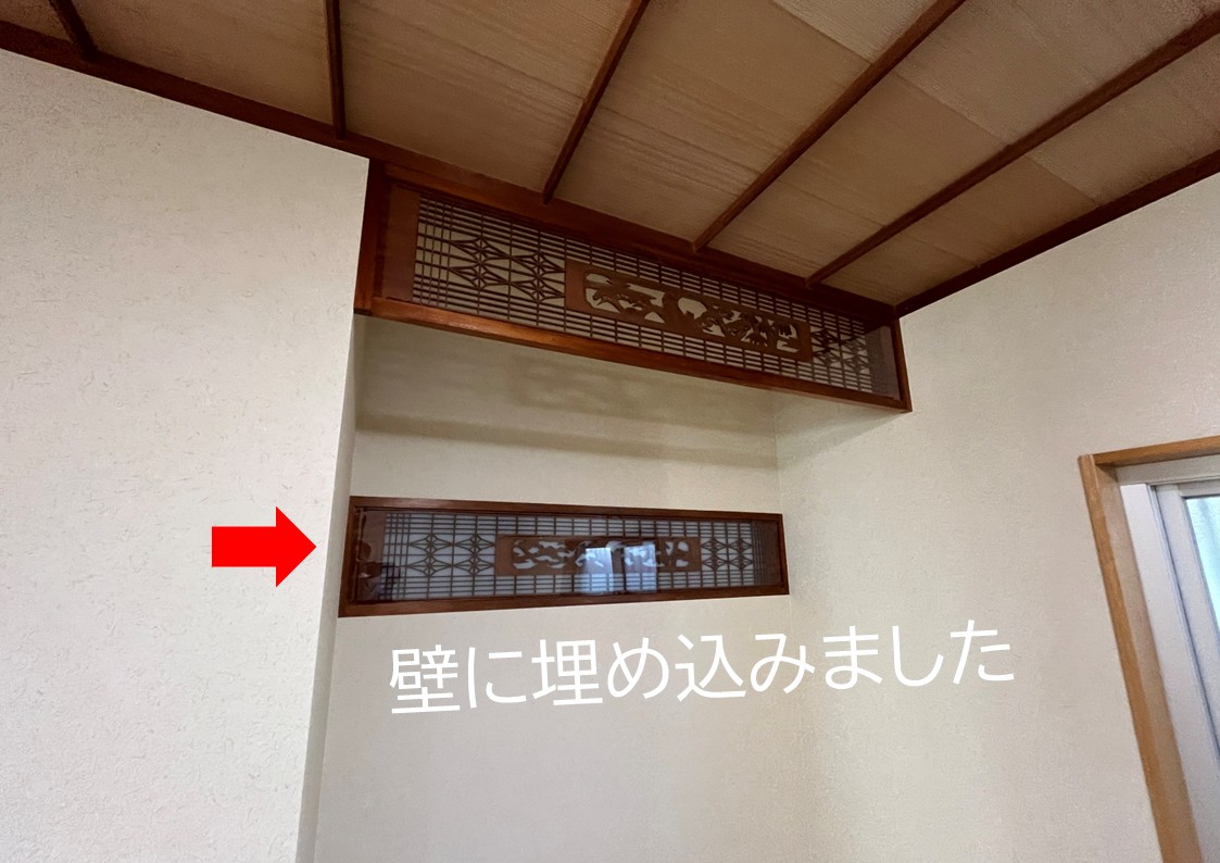 2枚あった欄間のうち、1枚は職人さんの提案で、壁に埋め込みました。
